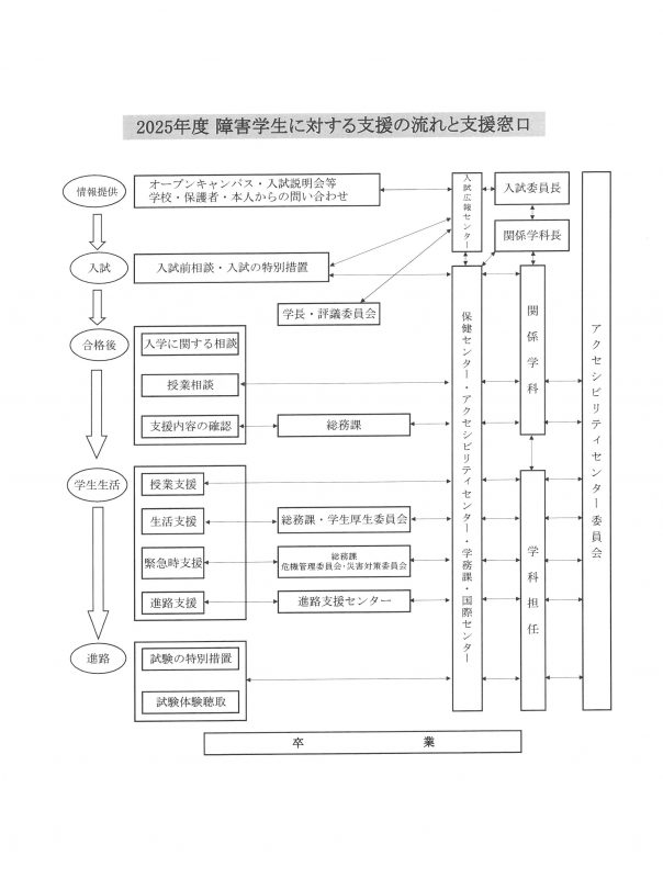 平成28年に「東北文教大学・東北文教大学短期大学部障害学生修学支援規程」、ならびに「東北文教大学・東北文教大学短期大学部アクセシビリティセンター委員会規程」を制定し、アクセシビリティセンター委員会と障害のある学生が志望又は所属する学科や関係各部署が連携し、修学等支援について対応しています。学生本人の要望に基づき、支援内容について学生や保護者の方と話し合い検討します。支援を希望する学生は、気軽に相談してください。支援内容について