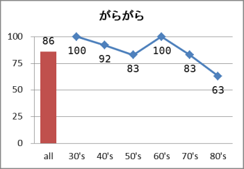 : 全世代86点、30年代生100点、40年代生92点、50年代生83点、60年代生100点、70年代生83点、80年代生63点