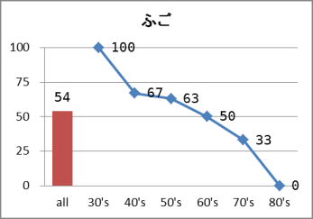 : 全世代54点、30年代生100点、40年代生67点、50年代生63点、60年代生50点、70年代生33点、80年代生0点