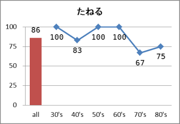 右に見た残存傾向語は、使用度全体からみても高く、世代を超えて今も使われていることが確かめられる。上には掲げていないが、すでにほとんど使われなくなりつつあることばもある。使用度全体としては60点程度を保ちながらも、今後急激に衰退していくことばがそれである。