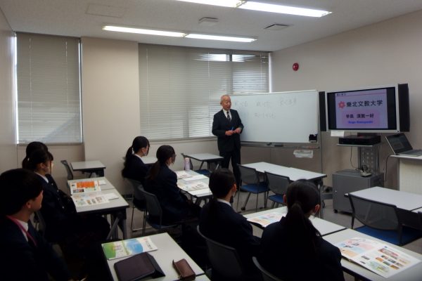 歓迎の挨拶では、”大学とは学問や研究をする場であること”、そして”本学は「人」について学ぶ大学であること”を須賀学長にお話ししていただき、また、「日本語の探究」についてのミニ講義も受講していただきました。