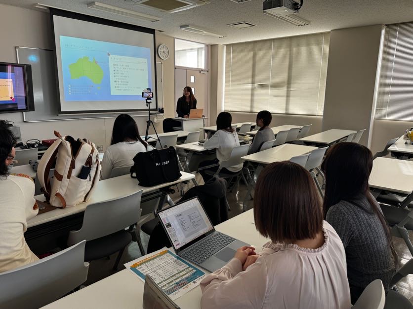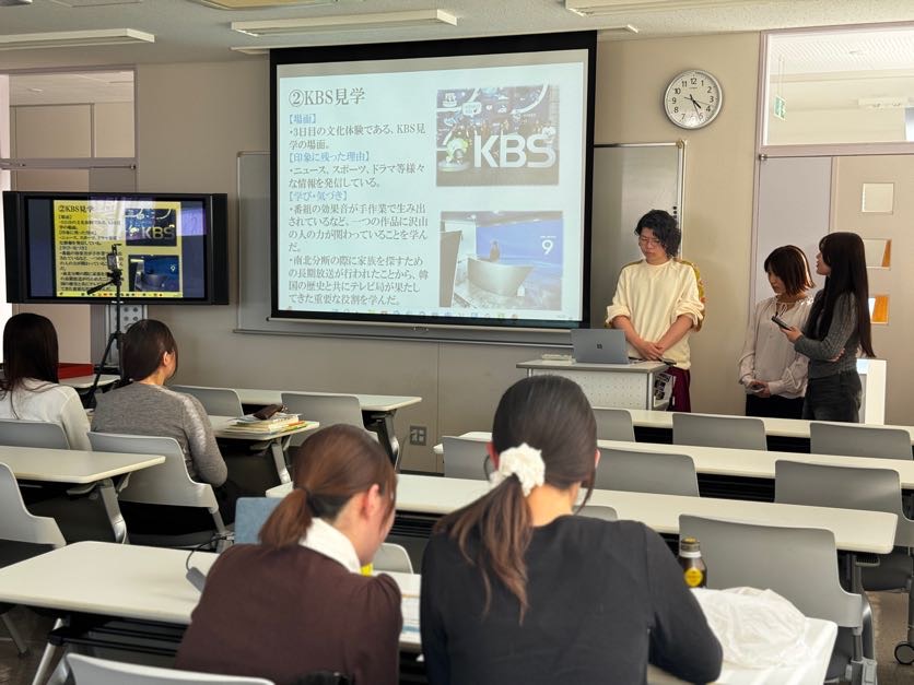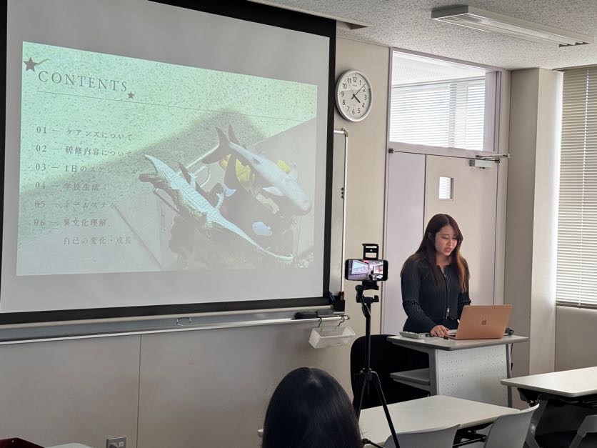 今回の説明会では、2026年2月に実施された「異文化入門フィールドワーク(韓国)」参加者による体験談に加え、韓国・建国大学語研修およびオーストラリア語学研修参加者による発表を行いました。現地での学びや日常生活の様子について、写真やエピソードを交えながら紹介され、参加学生の関心を集めていました。