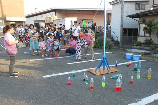 また、教育力向上サークル”ええじゃないか”は、あそびのイベント「ぶんぶん!ボーリング」を実施しました。紐のついたボールを三回投げ、ペットボトルで作ったピンを何本倒すことが出来るかというゲーム。子どもたちは一つのピンに狙いをつけ投げたり、思い切り回すように投げたりと大奮闘。