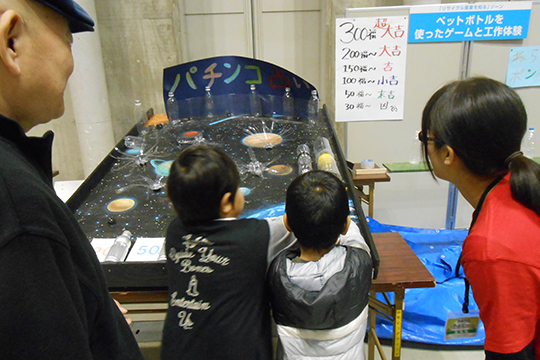 また、ペットボトルで作ったゲーム「ペットボトルぱちんこ占い」「ぶんぶんボーリング」やキャップを使った「コロコロ大作戦」「ねらってポンポン」などで来場した子どもたちに楽しんでもらいました。