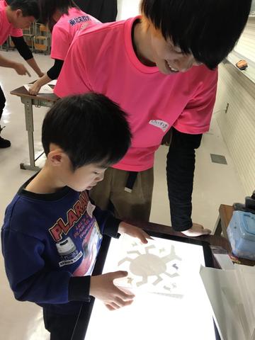 最後にみんなの作品を並べ、7色に変化するLEDライトを点灯すると、わぁ~!と歓声が上がりました。子どもたちはうれしそうに作品を持ち帰っていきました。