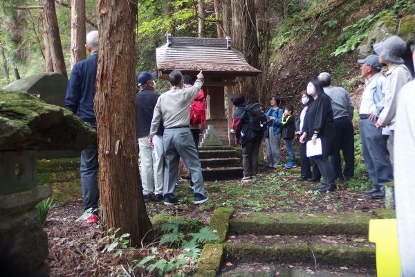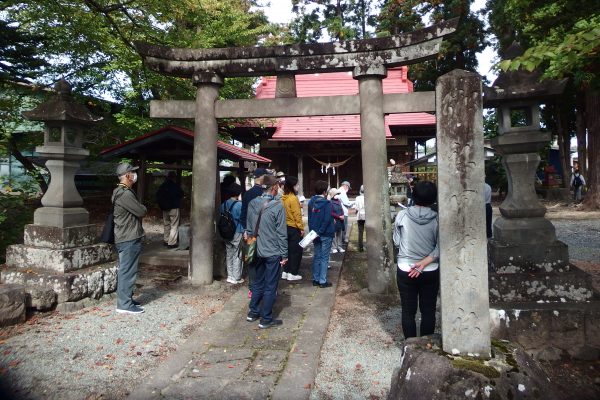 今回のコースは、「東北文教大学→円龍寺(えんりゅうじ)→須川の埋没林→甲箭(こうせん)神社→津金沢(つがねざわ)の大杉→四公人碑→松原神明(まつばらしんめい)神社→福田神社→松原不動尊→オサヤジ・愛染(あいせん)神社→東北文教大学」と厳選されたコースを約6時間の行程で楽しんでいただきました。各見どころスポットでは、南山形地区のプロジェクト委員2名のガイドから文化や歴史の解説をしていただきました。