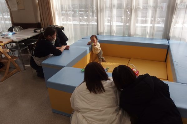 赤ちゃんのごはんが終わった後は、ママにゆっくりと温かい食事を楽しんでいただきました。その間、赤ちゃんはおもちゃで遊びながら楽しい時間を過ごしていました。通りがかった学生たちも思わず足を止め、赤ちゃんの姿に癒されていました。