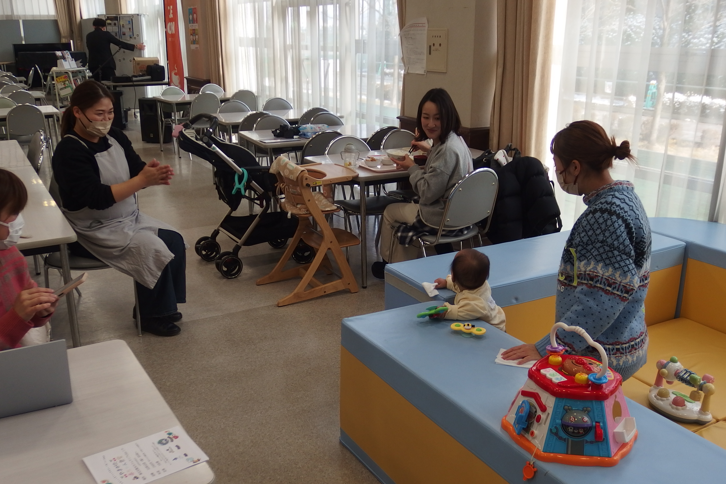 赤ちゃんのごはんが終わった後は、ママにゆっくりと温かい食事を楽しんでいただきました。その間、赤ちゃんはおもちゃで遊びながら楽しい時間を過ごしていました。通りがかった学生たちも思わず足を止め、赤ちゃんの姿に癒されていました。