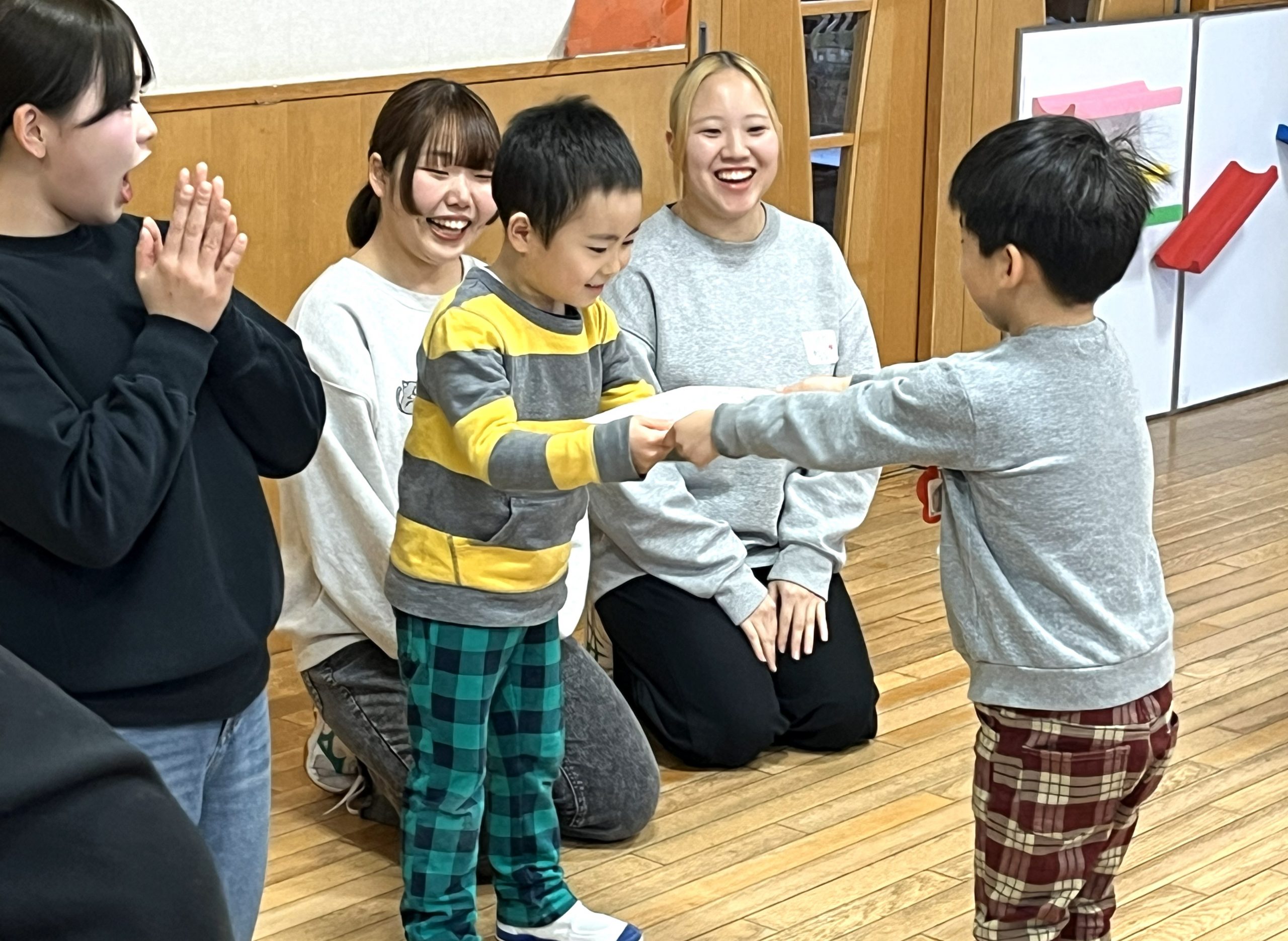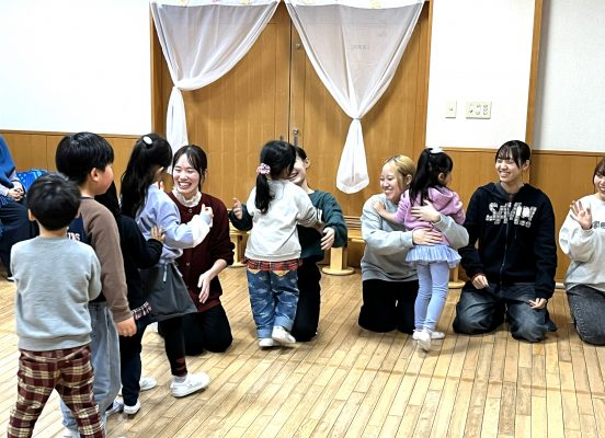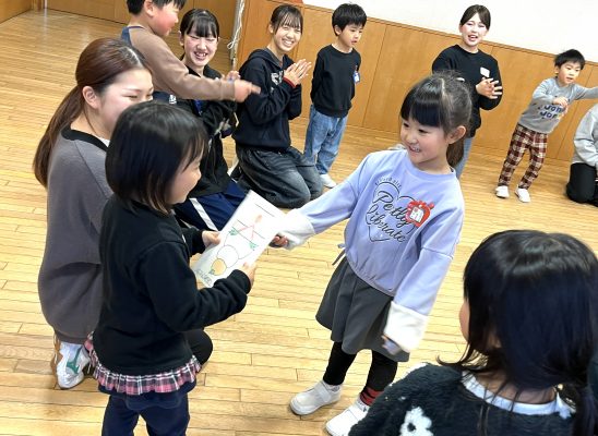 年明けの活動でお正月にちなんだわらべうたができて良かった。「ゆうびんはいたつ」では、自分に年賀状が届くのを楽しみにワクワクして待っている子どもたちの姿が見られた。「うさぎのもちつき」では、手の動きを楽しんでいる子どもの姿が見られた。少し難しいバージョンでも学生の動きを真似しながら子ども同士でも楽しむ姿が見られた。今年度最後のわらべうたもとても楽しい活動になった。