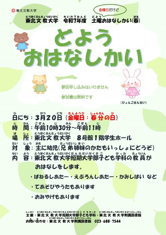 東北文教大学を会場として、下記の通り令和7年度 「土曜おはなしかい(春)」を開催いたします。