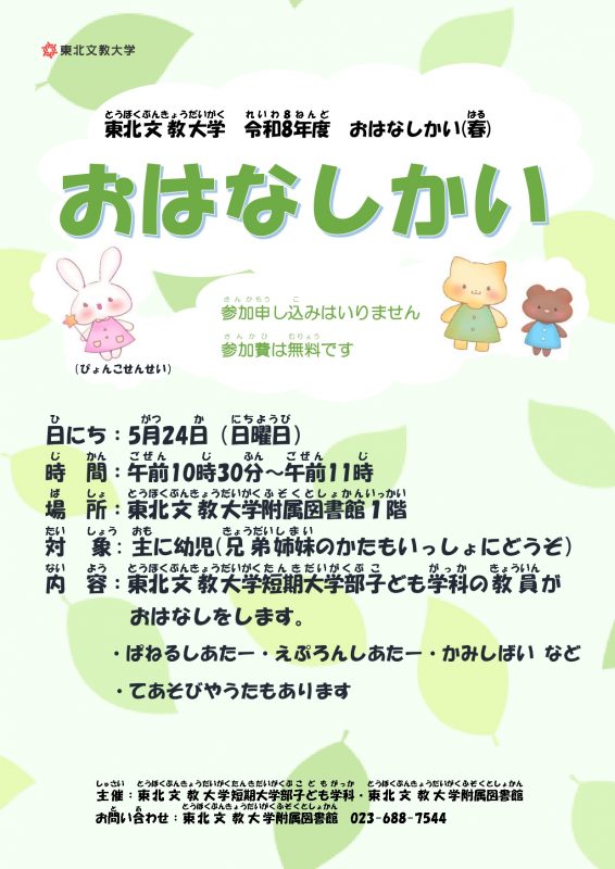 東北文教大学 附属図書館を会場として、下記の通り令和8年度 「おはなしかい(春)」を開催いたします。