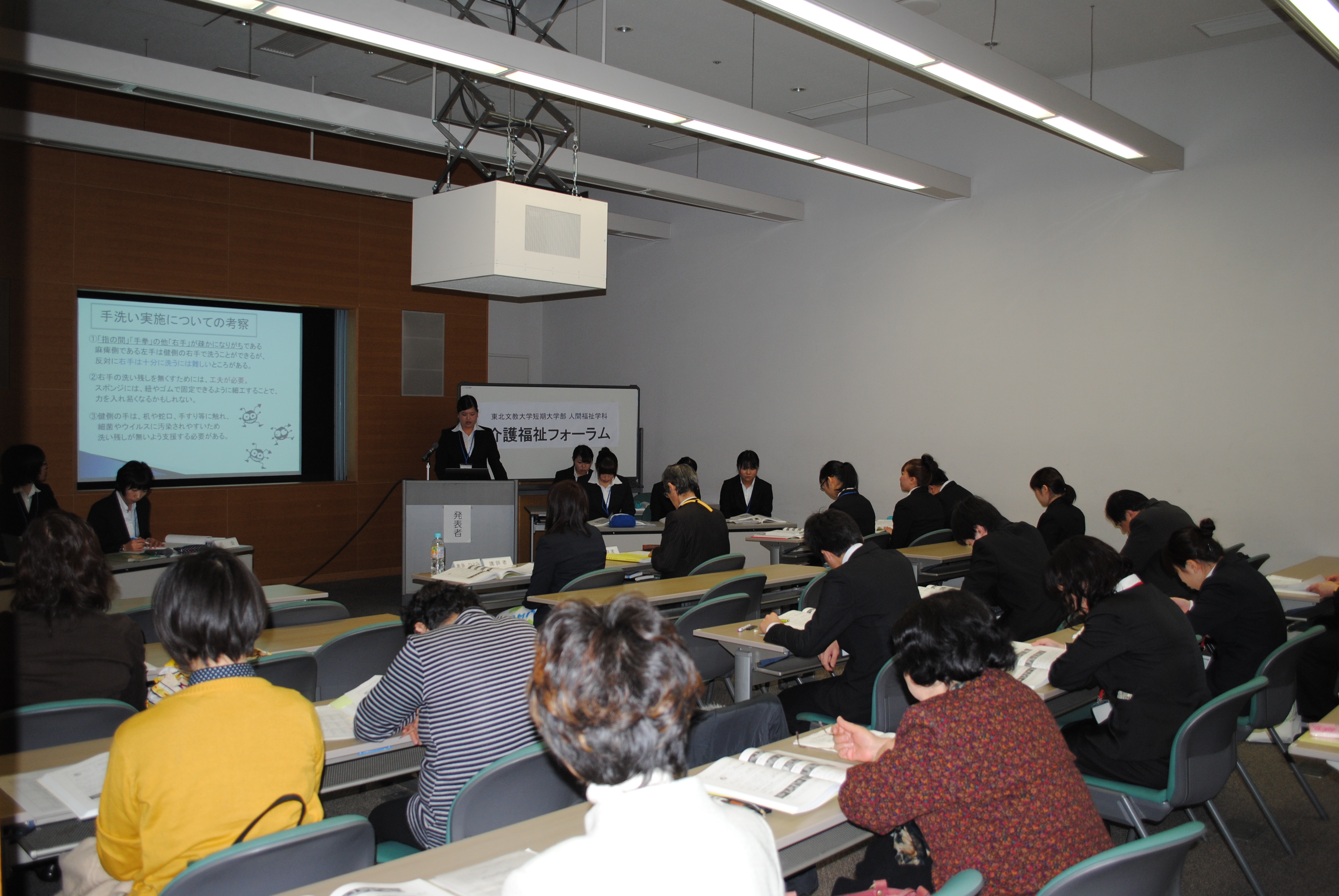 去る1月20日(火)山形テルサにて「介護福祉フォーラム」が開催されました。 発表の内容は、介護実習での実践報告、実践内容から知りえた支援内容をより深めたものなど多岐にわたりました。今後、介護福祉の現場で活躍する2年生にとって、貴重な体験となったことでしょう。