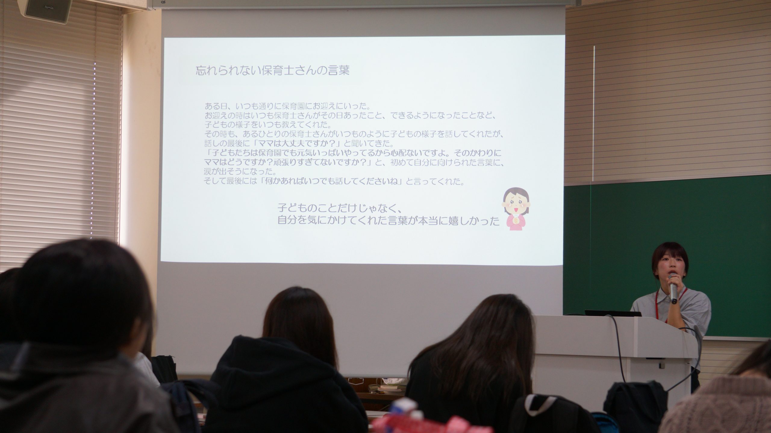 子ども学科、子ども教育学科の「乳児保育Ⅱ」授業において、「乳児保育における保護者理解と支援~メンタルヘルスの視点も踏まえて~」と題してゲストスピーカー講義を実施しました。講師は4児の子育てをしながら、精神科看護師として働く佐藤明日香先生。「母親」「精神看護師」という2つの経験から、保護者理解と支援について学びを深める大変貴重な時間となりました。