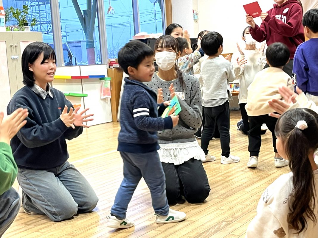 今回の伝承遊びでは、全体的にとても良かったと思いました。手遊びの「やきいもグーチーパー」では、子どもたちの反応を見て、回数が多くも少なくもなくちょうどいいタイミングで次に移ることが出来ていたと思います。「おせんべ焼けたかな」は前回もしていたこともありスムーズに進めることができ、子どもたちも「3枚も食べれた!」「まだ食べれる!」と、楽しんでいる様子が見られました。「ゆうびんはいたつ」は、2つのグループでした時より全員でした時の方が子どもたちの反応が良かったと思います。恥ずかしくてできない子ややりたいけどできなかった子がいたため、次回する時は言葉がけの工夫や誰がしていないかなどの把握もできるようにしたいと思いました。