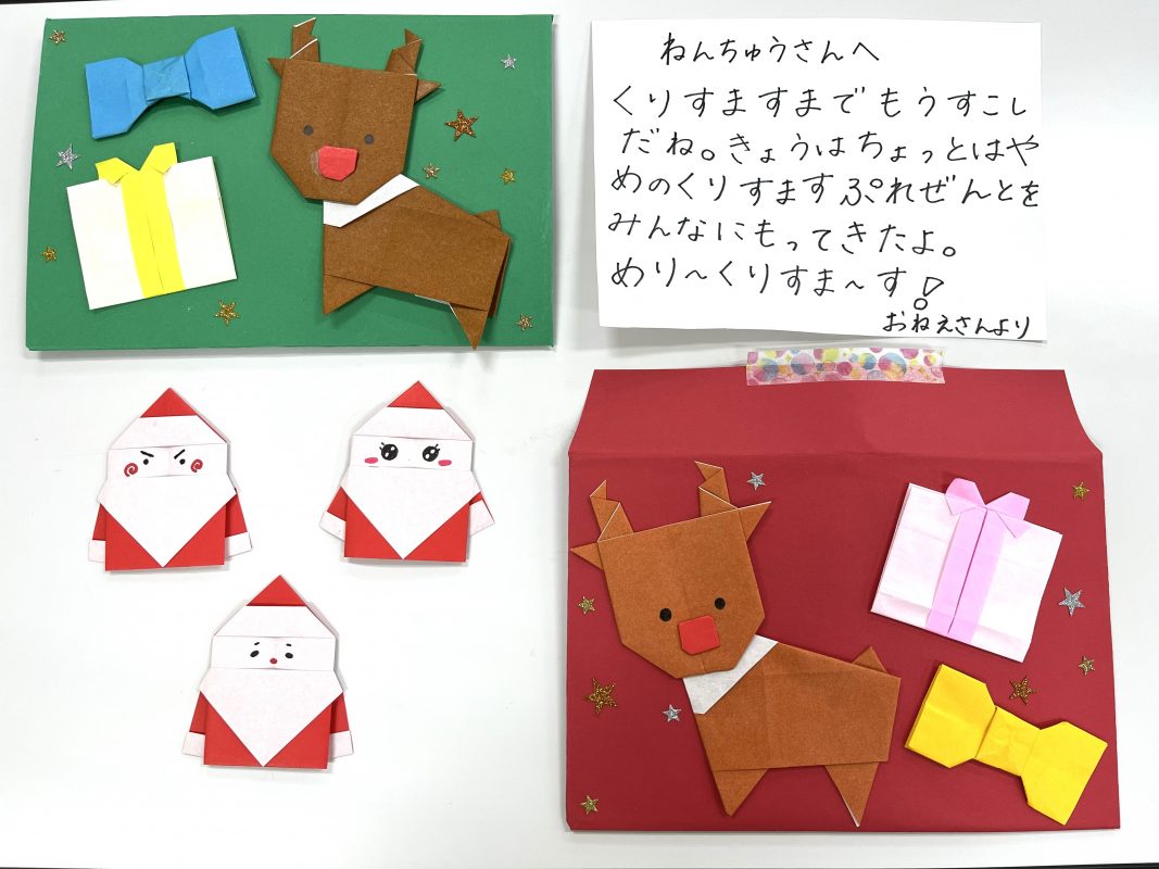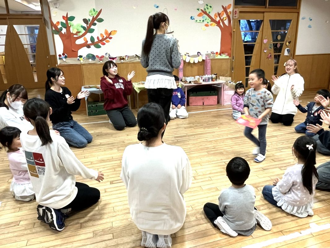 今回は導入で「焼き芋グーチーパー」をしたところ、実際に焼き芋を園で食べていたことからほとんどの子どもが楽しく参加している姿が見受けられた。また、「おせんべい焼けたかな」では、焼き終わった私たちを見て一緒に遊んでいた子どもが「お姉さんたちまだお腹いっぱいじゃないよね。もう1回しよ」と表現していた。感性を豊かにするという点でもとてもよいわらべうただったと感じた。初めて行った「ゆうびんはいたつ」では、楽しそうに手紙を持ってお友達や学生に渡す姿が見られた。「まだ僕貰ってないよ」という子どもの声もあったため、次回改善する必要があると思った。全体的に学生の表情も良く、子どもたちも楽しそうに遊んでいたため、来月の最後のわらべうたでも子どもたちと親しんで遊べるようにしたい。