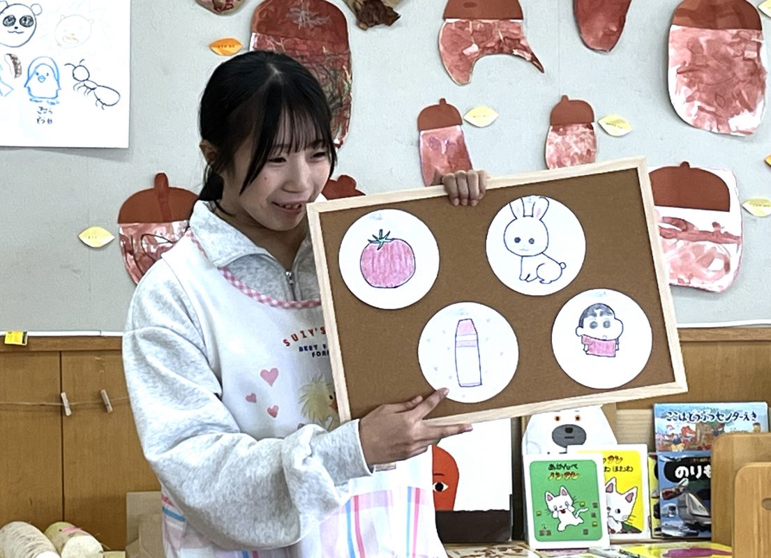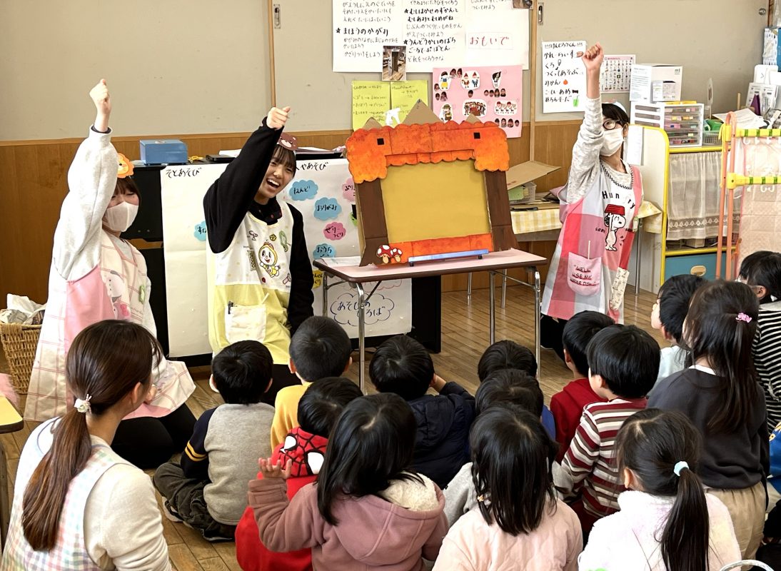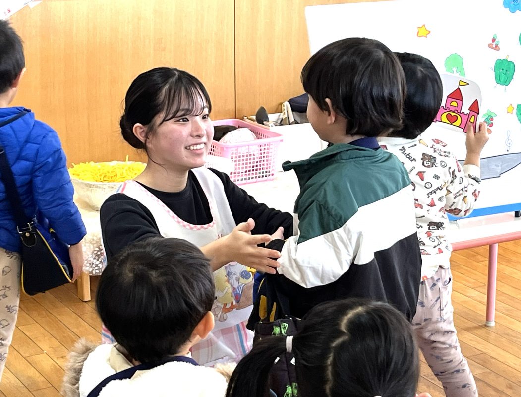 子ども学科では、幼稚園教諭二種免許状取得のために、1年次教育実習Ⅰ(10日間)と教育実習Ⅱ(10日間)を設置しています。今年の教育実習Ⅰは、1期(8月21日~9月10日)、2期(11月6日~12月1日)の期間に、abクラス・cdクラス・efクラス、それぞれ5日間ずつ本学付属幼稚園で実施し、全員無事終了しました。1期2期とも初日には、手作りの教材を用いた自己紹介を行い、子どもたちとの距離を近づけ、子どもに関わりながら学びを深めました。また、2期の最終日には、自分たちで計画した「歌とお話しのプレゼント」を披露し、子どもたちへの感謝を示しました。 実習終了後は、実習指導科目を中心に、保育内容関連科目において、科目の内容に即した振り返りを行っています。