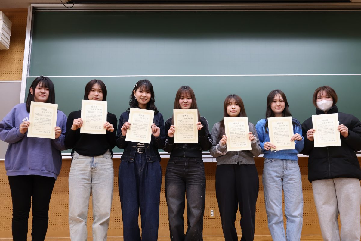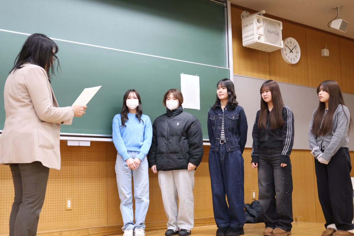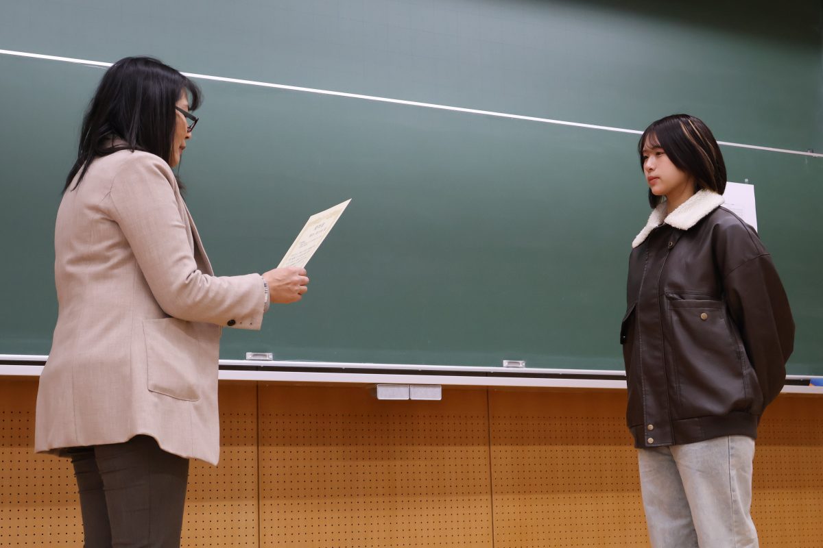 オリエンテーションの冒頭には、先日の卒業研究発表会の際に発表した卒業論文の優秀者に対し、表彰が行われました。優秀論文として選ばれた学生一人ひとりに対し、奥山優佳学科長より賞状が手渡され、学生からも盛大な拍手が送られました。