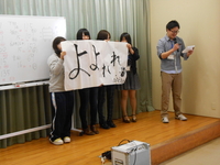 メインの活動のグループワークトレーニングにおいては、4~5名で編成するクラスのメンバーが協力して、その①として、各教員が自分の教育・研究分野に関する課題を提示し、クリアすると文字カードが与えられ、より多くのカードを集めるといったもの。その②として、集めた文字カードから多くの単語をさがしだすといったもの。その③として集めた文字カード文字を使い、新たな言葉を創造し、その意味や活用法を創作し、また、書道紙(90cm×160cm)に墨汁、毛筆で表現し、発表会においては論理的にプレゼンテーションできるかを競い合いました。