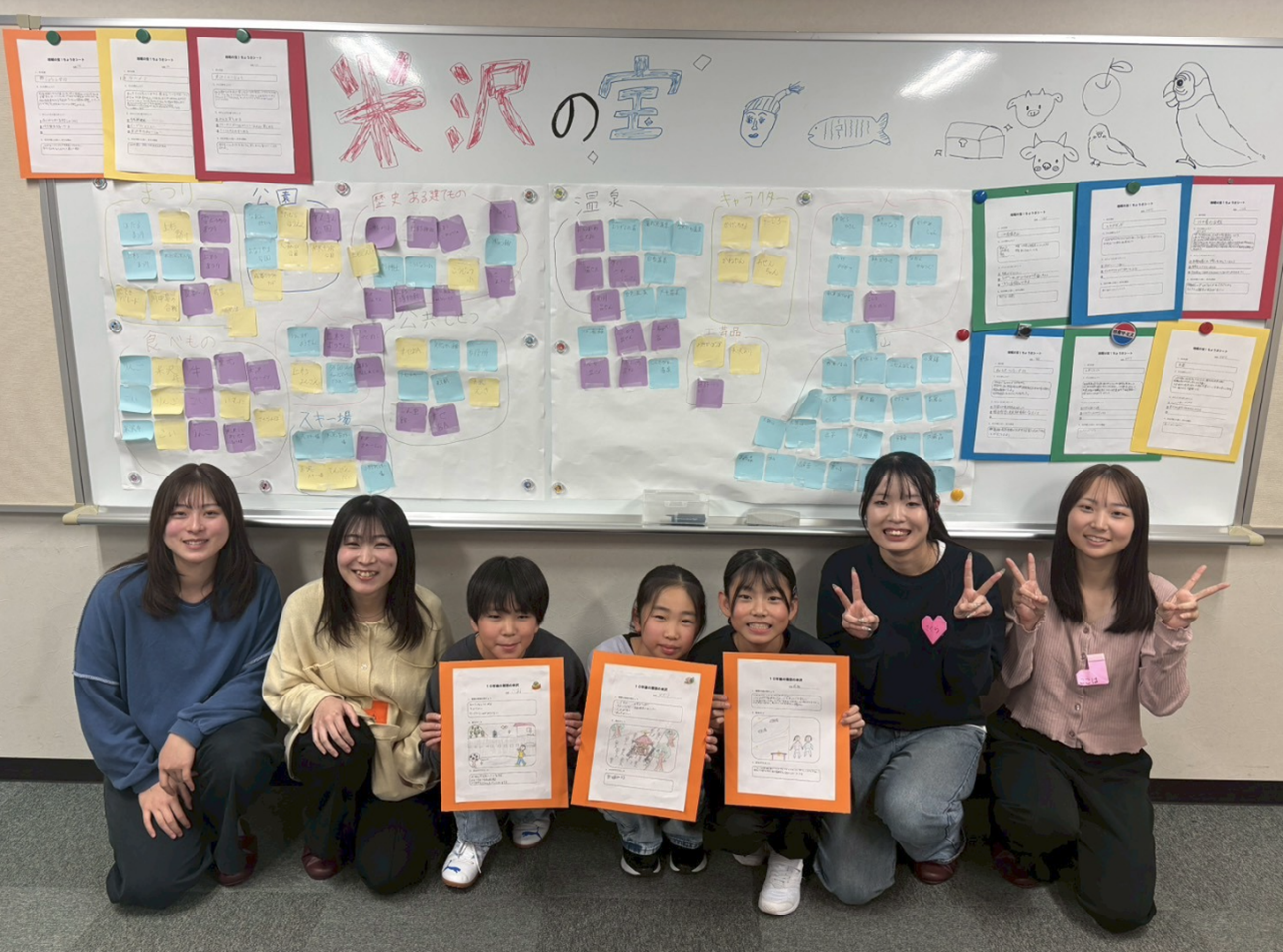 このシビックプライドを、地域の子どもたちに育てるにはどうすればよいかを問題意識としている子ども教育学科の学生が、卒業研究の一環として、米沢市の小学生と保護者の協力を得てワークショップを試作し、開催しました。来年度から先生となるゼミ生たちにも手伝ってもらいながら、校内や催事できる教材の完成をめざしています。