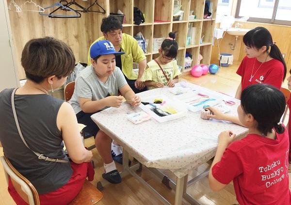 東北文教大学は、おばけ風船作り、うちわ作り、アクセサリー作りなど、身近な教材を使った制作遊びやボーリング遊びの環境設定をしました。当日、「むらとくげんきまつり」を楽しみに、親子連れやご家族揃っての参会者で学校内は大変な賑わいでした。学生が考えたコーナー遊びにも沢山の方が訪れ、自分で作ったうちわを喜んで使ったり、アクセサリーを身につけたりして笑顔が溢れていました。PTAの方から、「子ども達がとても喜んでいました。」「また、来年も是非お願いします。」と嬉しい言葉をいただいてきました。