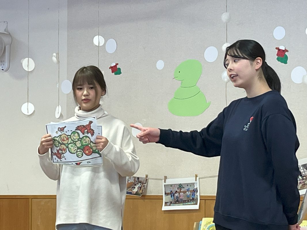 1 月 9 日(木)、子ども学科正課外活動「伝承あそび」に参加している 1、2 年生が、付属幼稚園で年中児といっしょにわらべうた遊びを楽しみました。2 年生の交代制リーダーを中心にわらべうた遊びのプログラムを組み、練習し、実践した様子を、学生達の感想や写真とともに紹介します。後期の毎月一回実践中です。