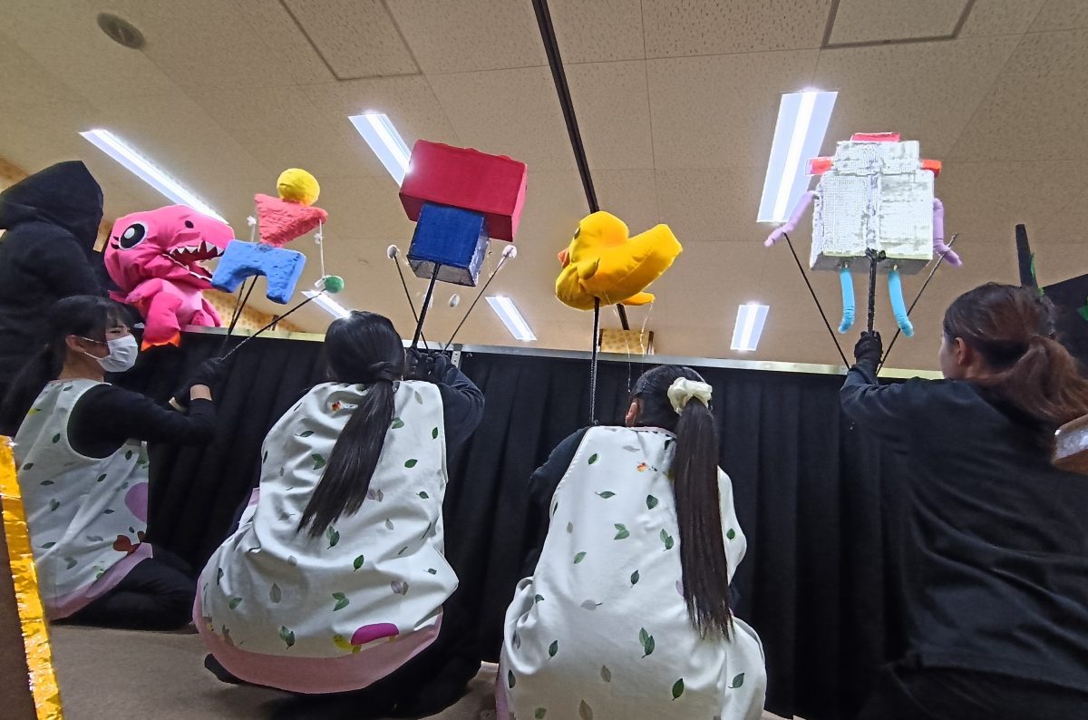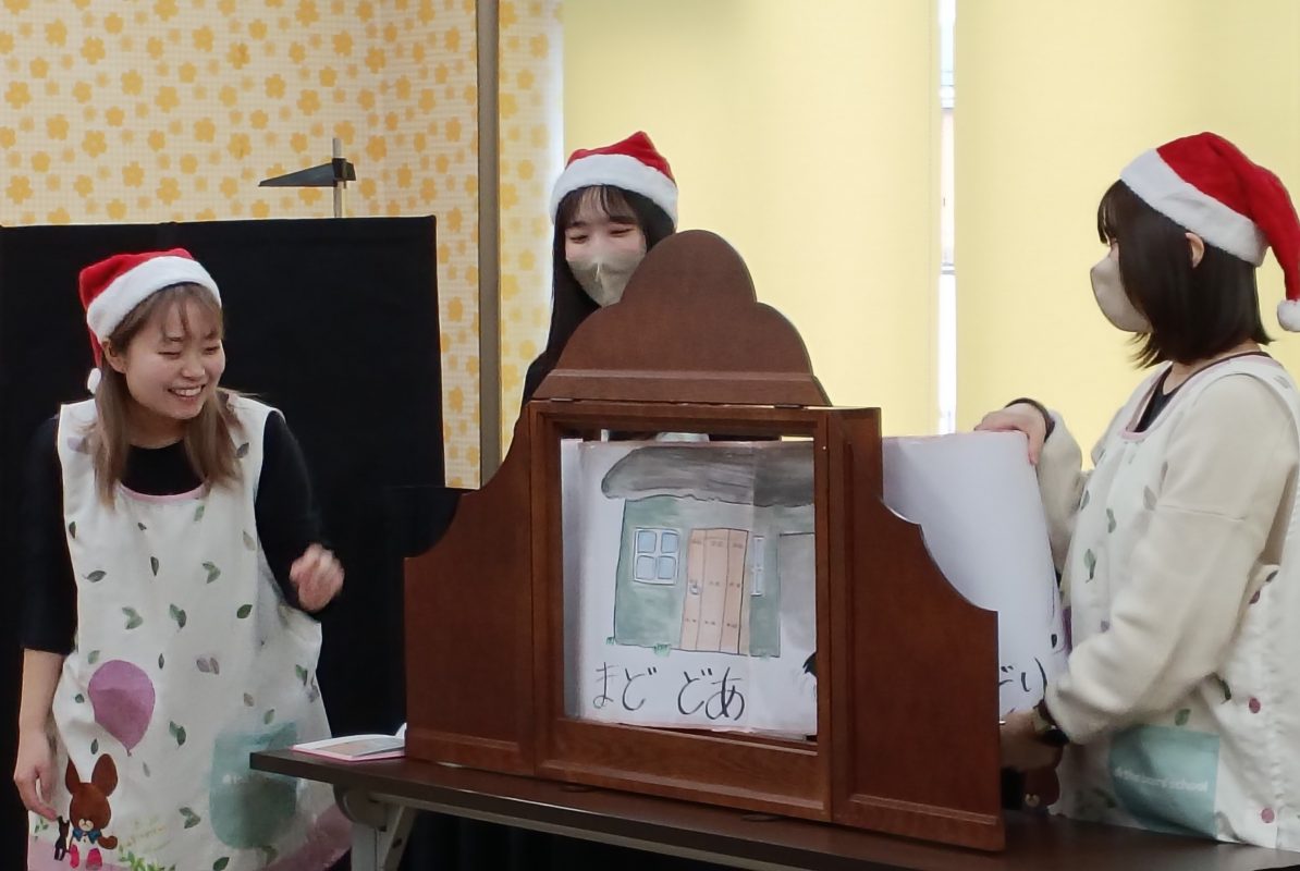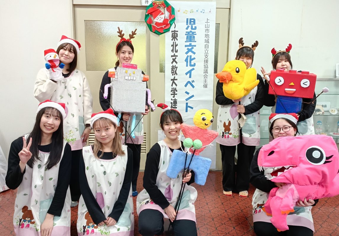12月24日(水)、上山市保健センターにて、上山市地域自立支援協議会が主催する「第4回児童文化イベント」が開催され、本学児童文化部が学外公演を行いました。当日は、人形劇『おもちゃの大冒険』の上演をはじめ、絵本の読み聞かせや手遊びなど、盛りだくさんのプログラムを実施しました。クリスマスイブということもあり、参加者の皆さんと一緒に楽しい時間を過ごすことができました。